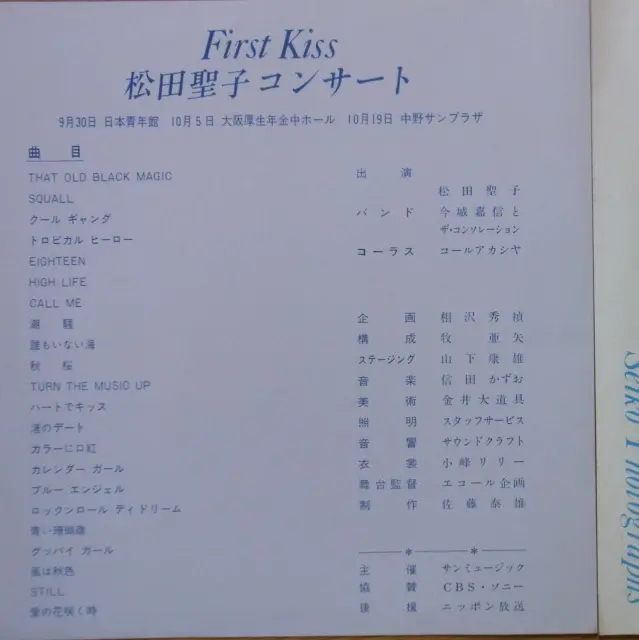 コンサートのタイトルは「First Kiss」と付けられ9/30の東京日本青年館、10/5の大阪厚生年金中ホール、10/19の東京中野サンプラザの3日行われています。